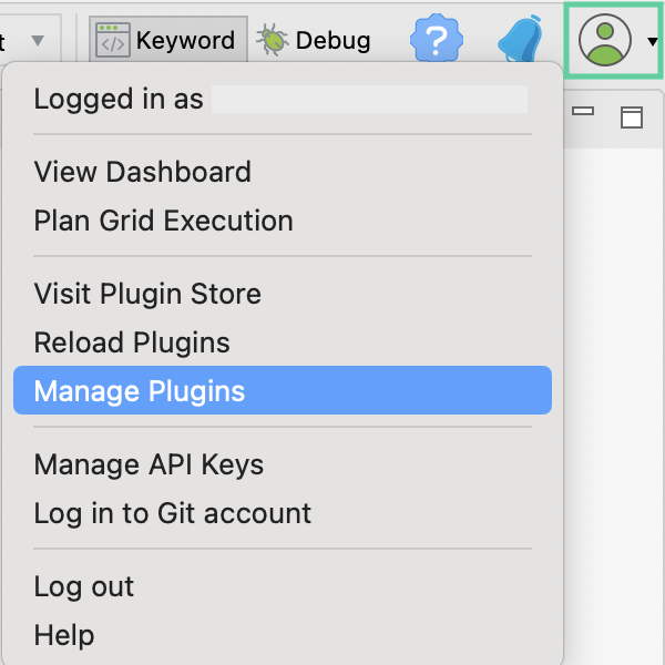 To view and manage Katalon Store plugins that you install in Katalon Studio, click on the dropdown next to the Profile icon at the top right corner of the Katalon Studio home page and select Manage Plugins.