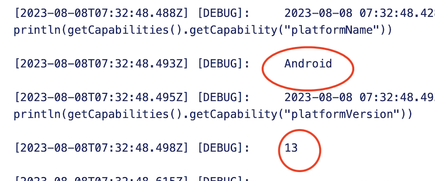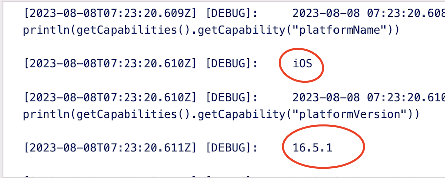 Users can use the code below to achieve the platform name and platform version when running tests with TestCloud devices.