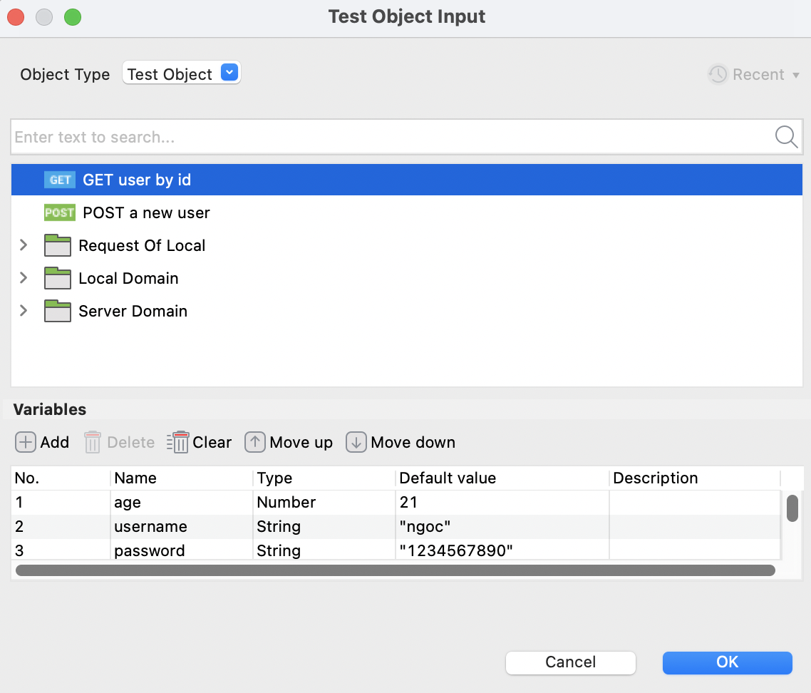 If you have used variables and parameters in test requests, you can pass values to the variables as follows: