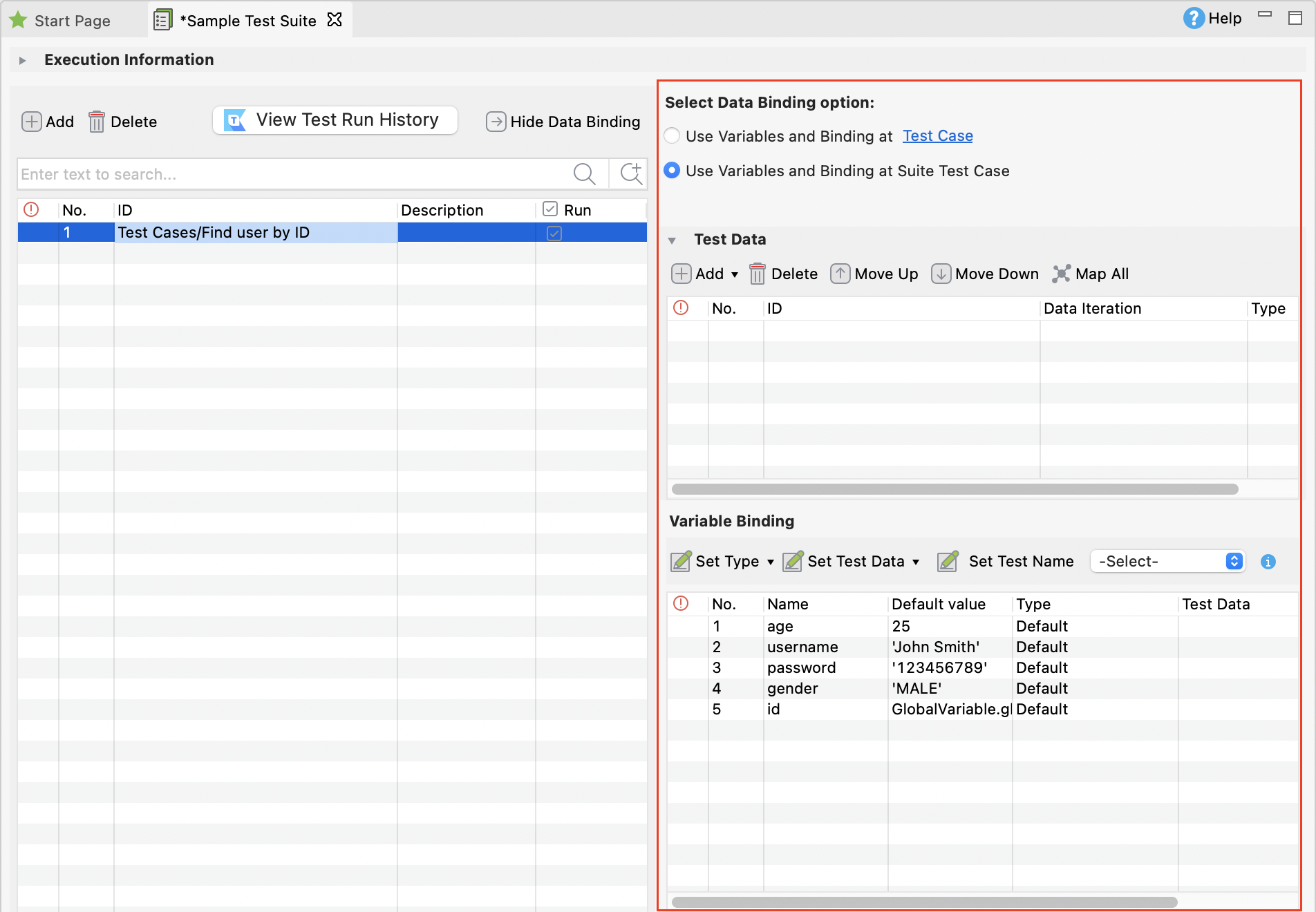 After configuring the test case with associated Web Service requests, we bind the test case to the test data in a test suite.