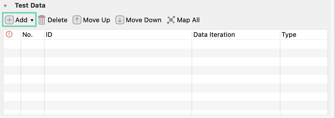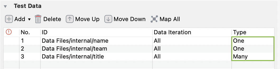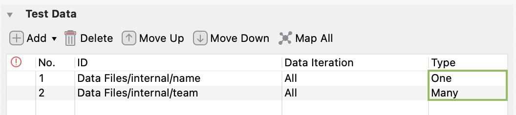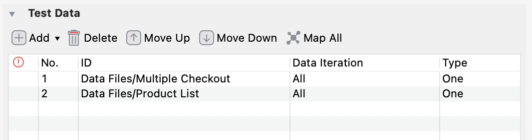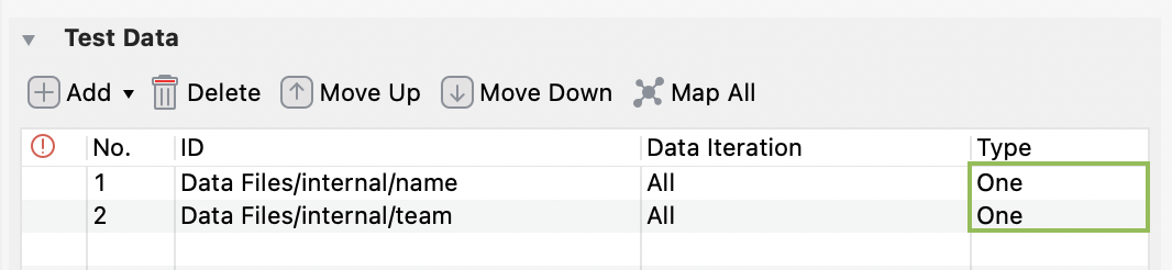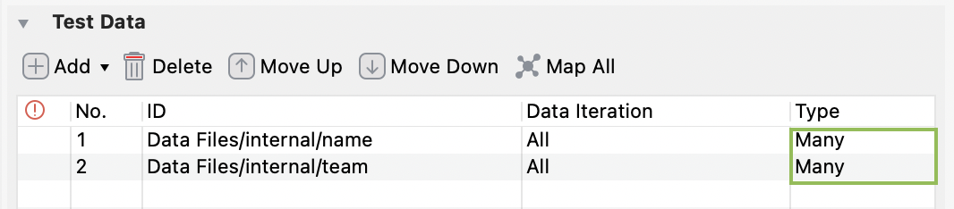 After adding data file(s) to the Test Data table, you can modify the data iteration. Double-click the cell under the Data Iteration column of each data file.