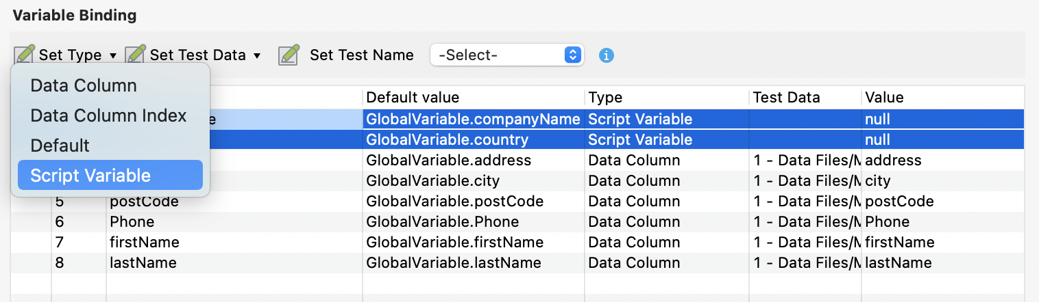 Test Data | This column is enabled if you set Type as Data Column or Data Column Index. To choose the test data file, double-click the cell under Test Data column of each variable. |