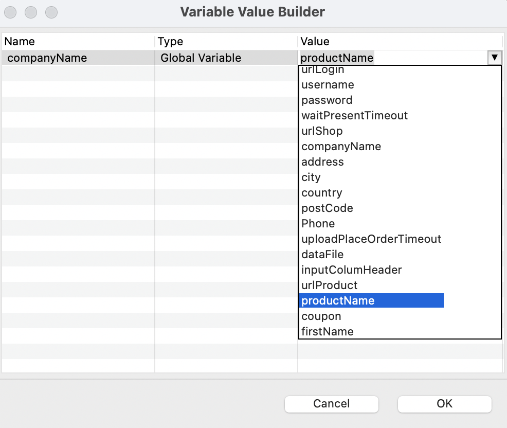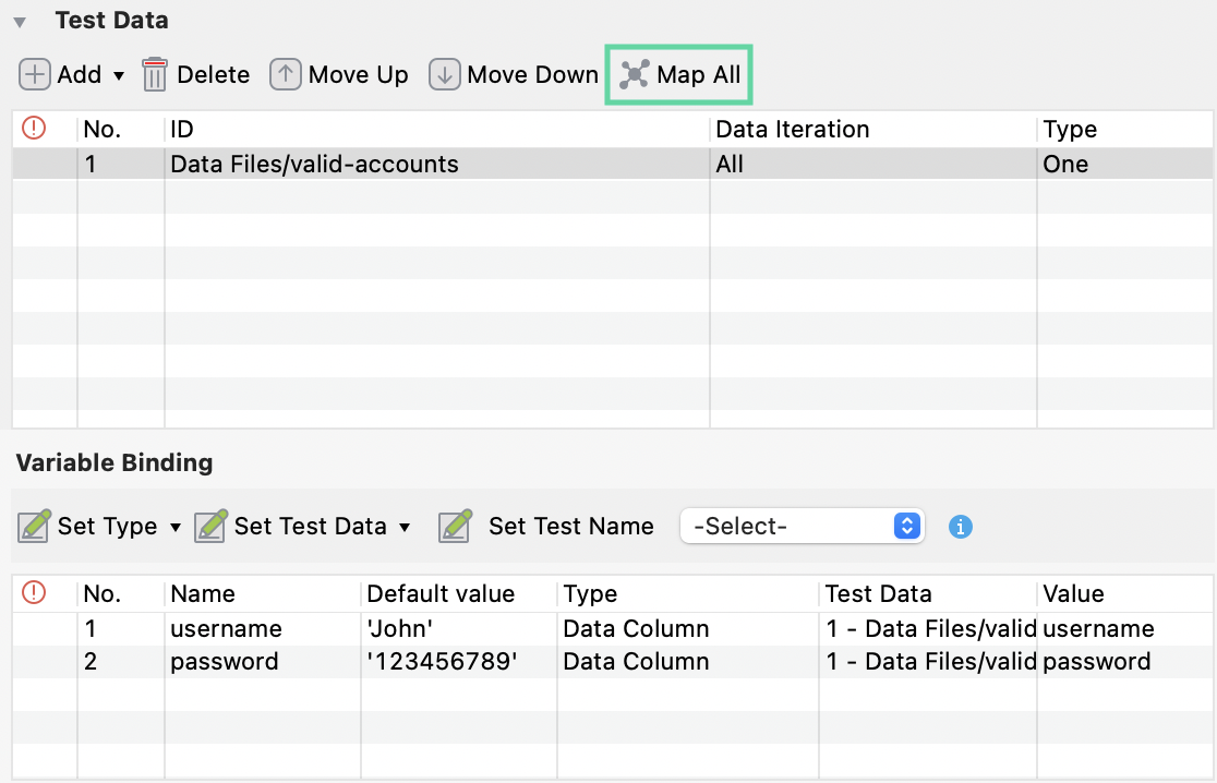 Value | Here you choose the according column header of the data file for each variable. If the variables and column headers of the data files share the same name, you can click Map All to quickly map them together. During execution, the username variable looks for the |