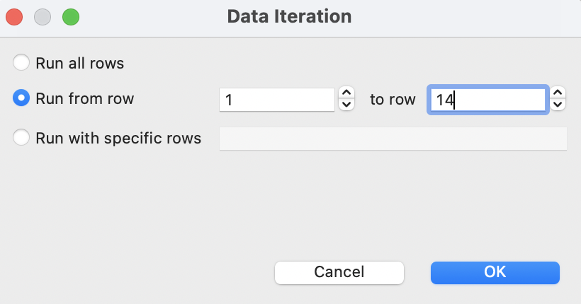 Run all rows | To use all the data rows in the data file in the test execution. |