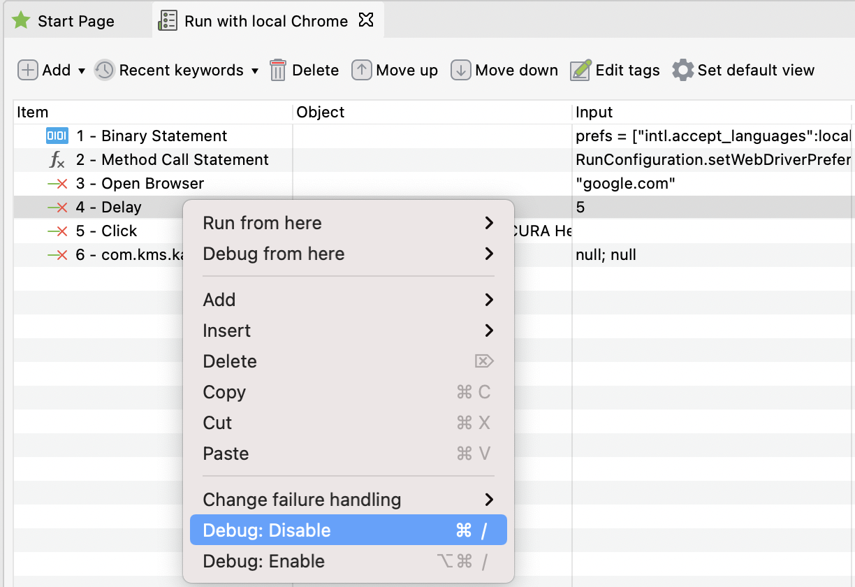 Katalon Studio allows you to enable or disable one or more test steps before executing the test case to skip unwanted steps during execution. You can use the provided keyboard shortcuts to perform the actions.
