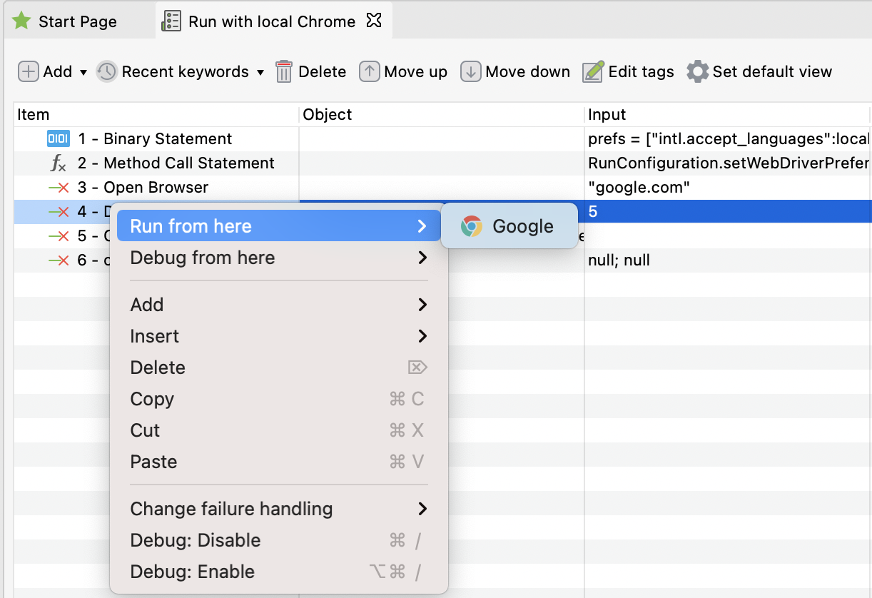 With this feature, you can resume the existing execution quickly. Katalon Studio currently supports Run from here with Chrome, Firefox, and Edge Chromium only. To use it, from the Manual view of a test case: