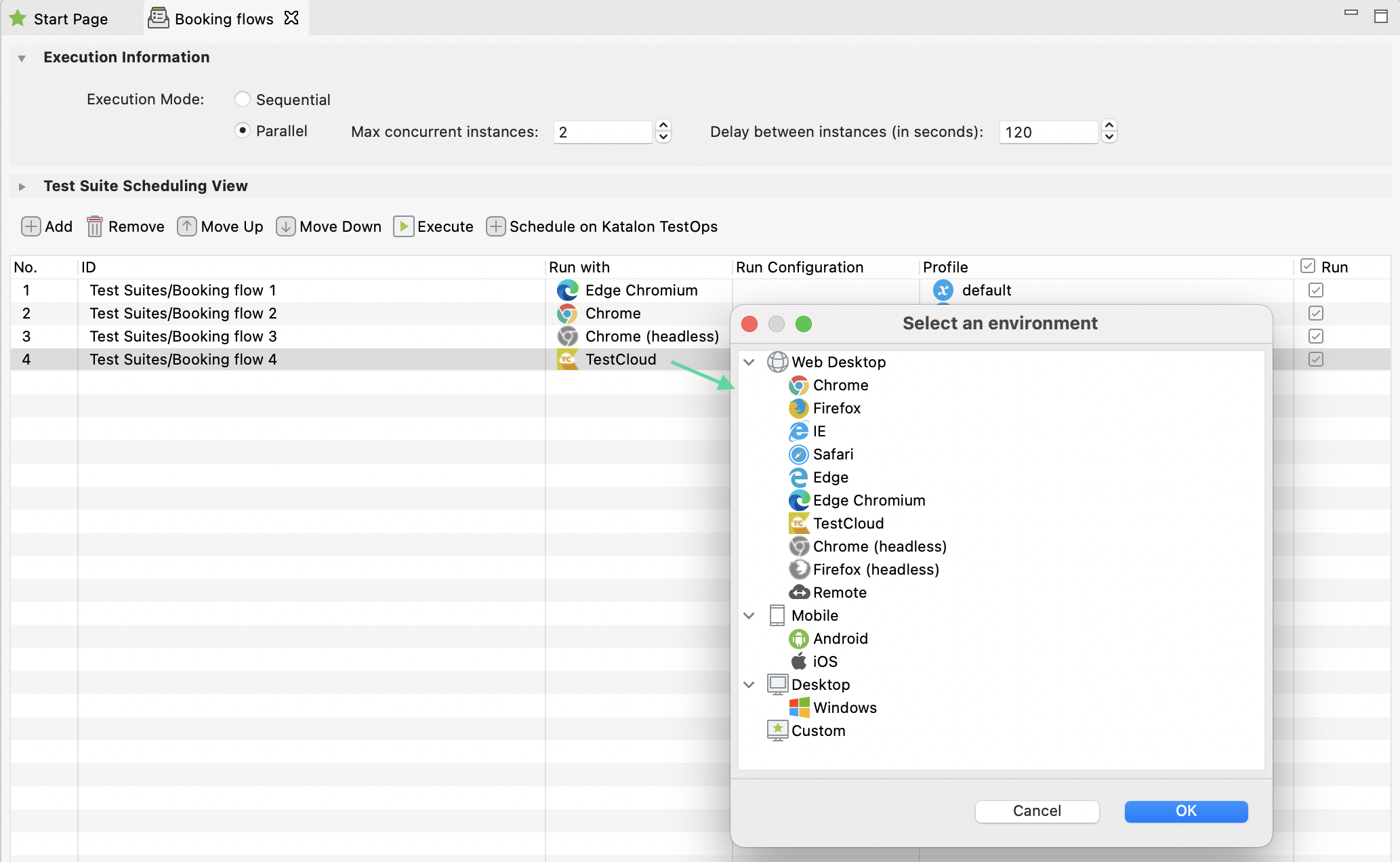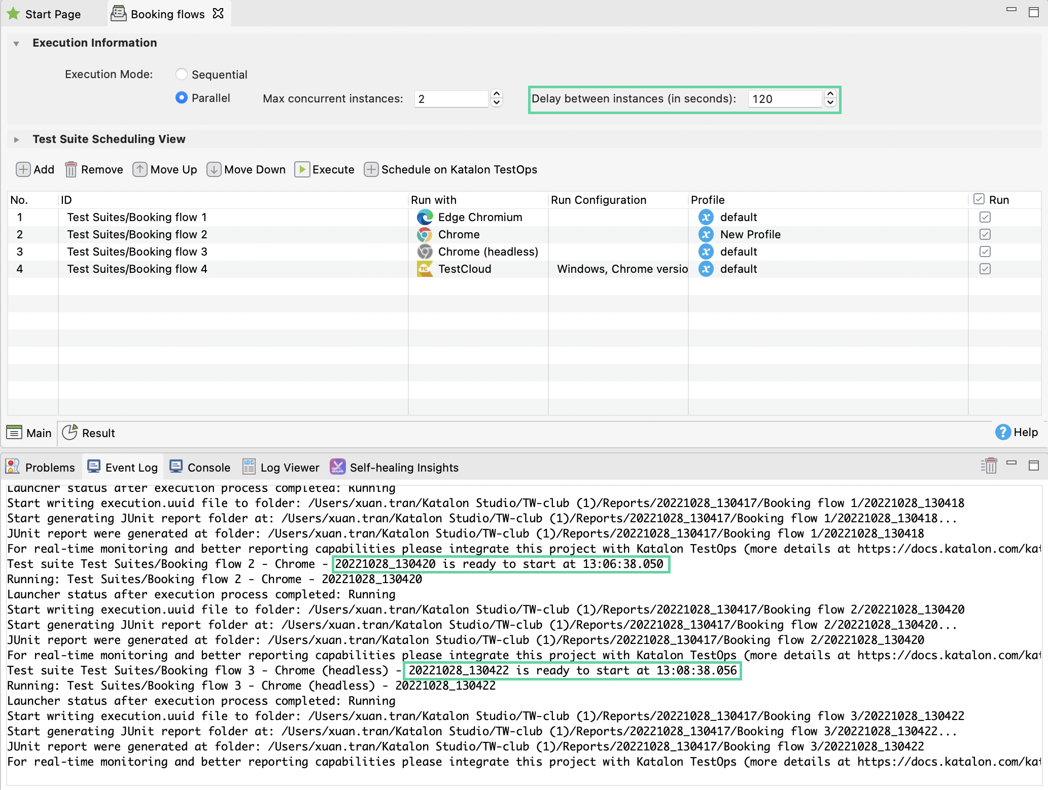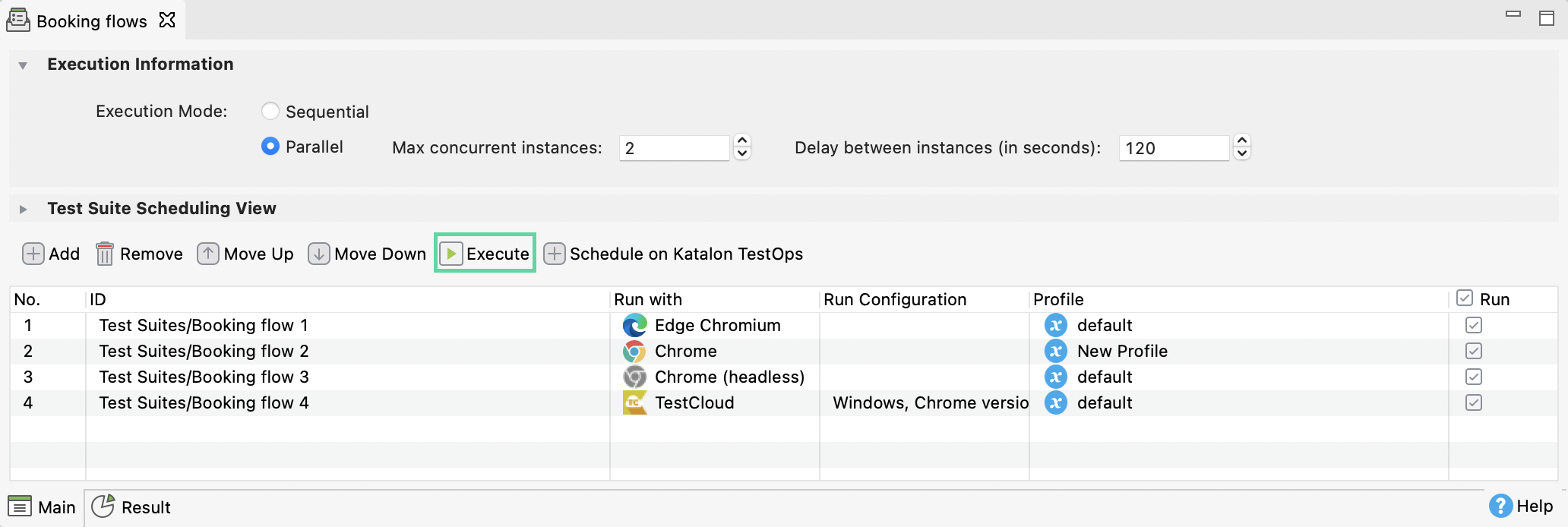 The parallel mode allows you to execute multiple test suites at the same time. With the parallel mode, you can set: