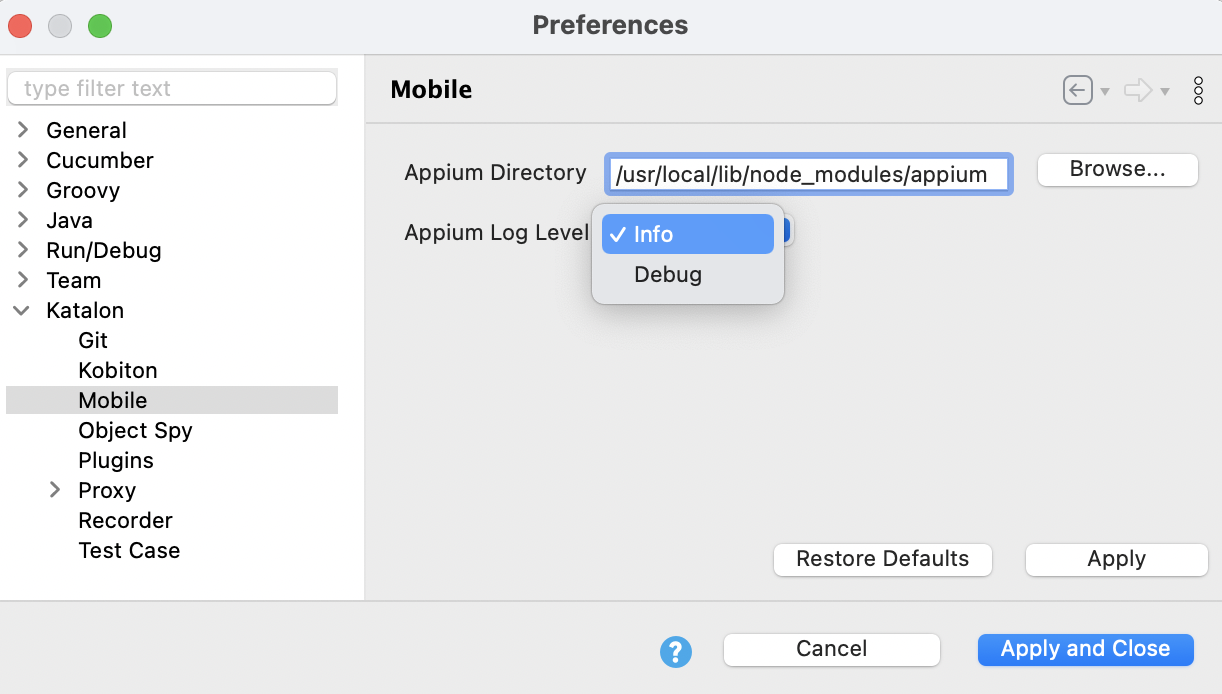 Katalon Studio supports Appium version 1.12.1 onwards. In Katalon Mobile Preferences, you can set up your Appium directory and the Appium Log Level.