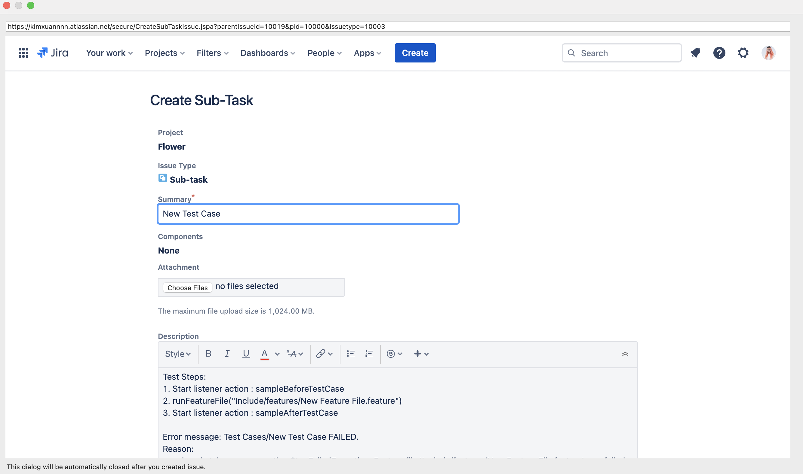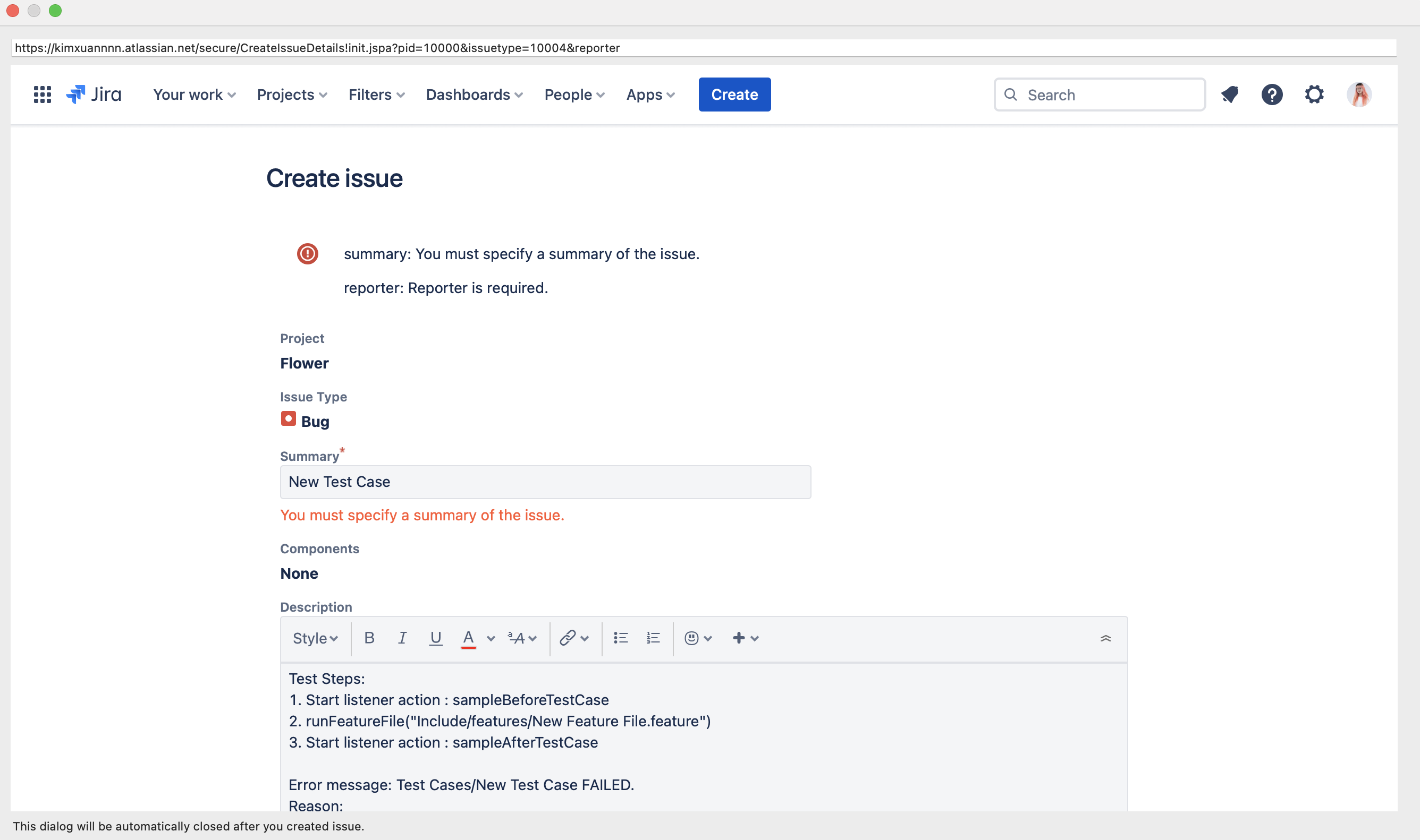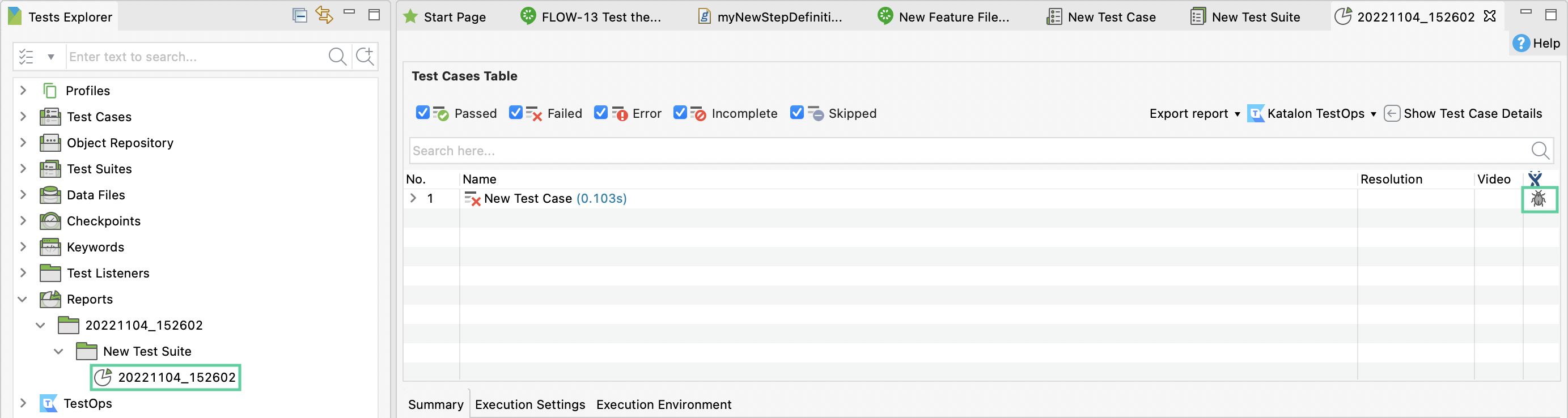 After executing a test suite in Katalon Studio, you can submit an issue to Jira directly from the test reports page of Katalon Studio.
