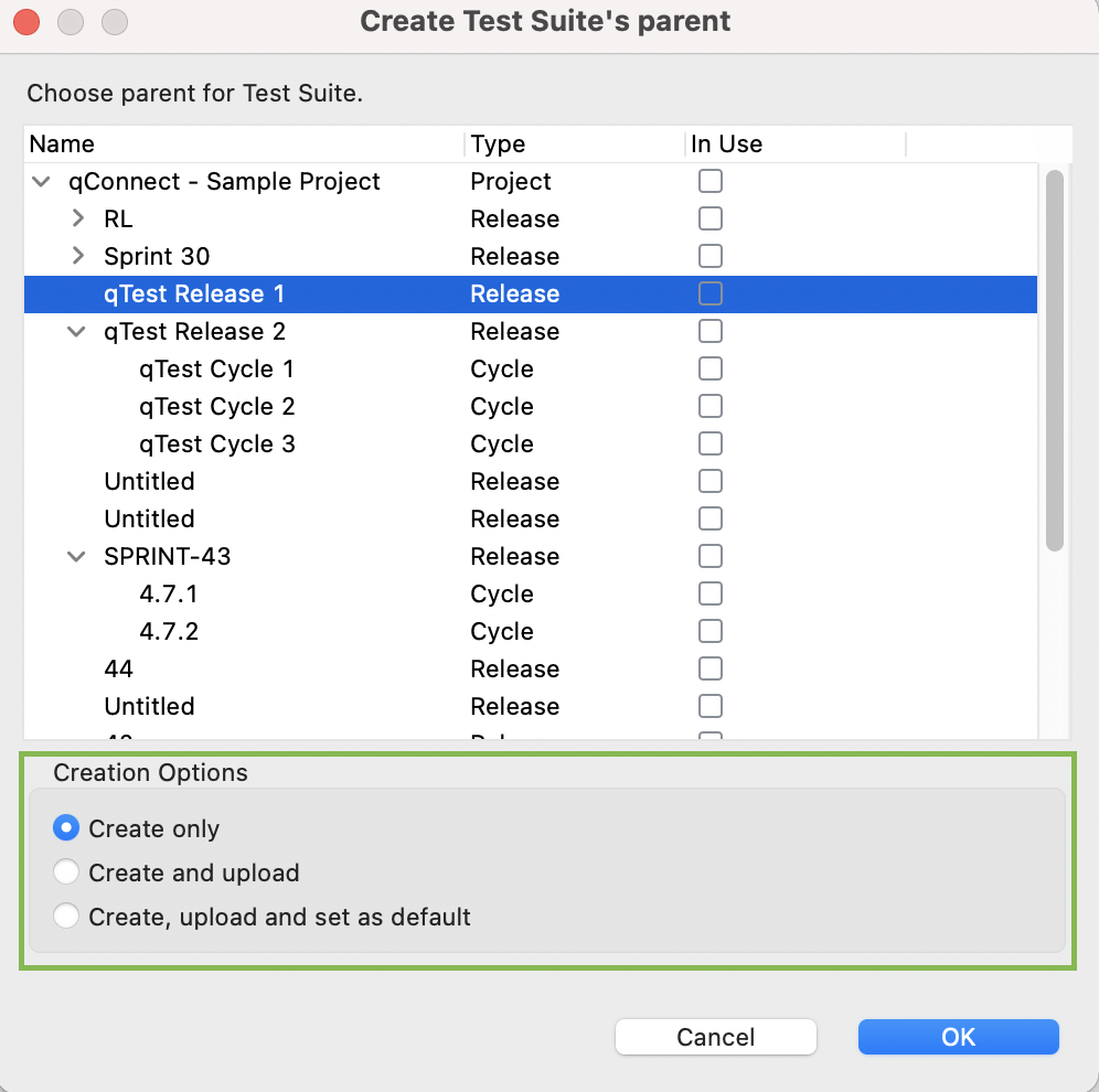 In the Creation Options section, choose one of the the following options to upload test suites automatically: