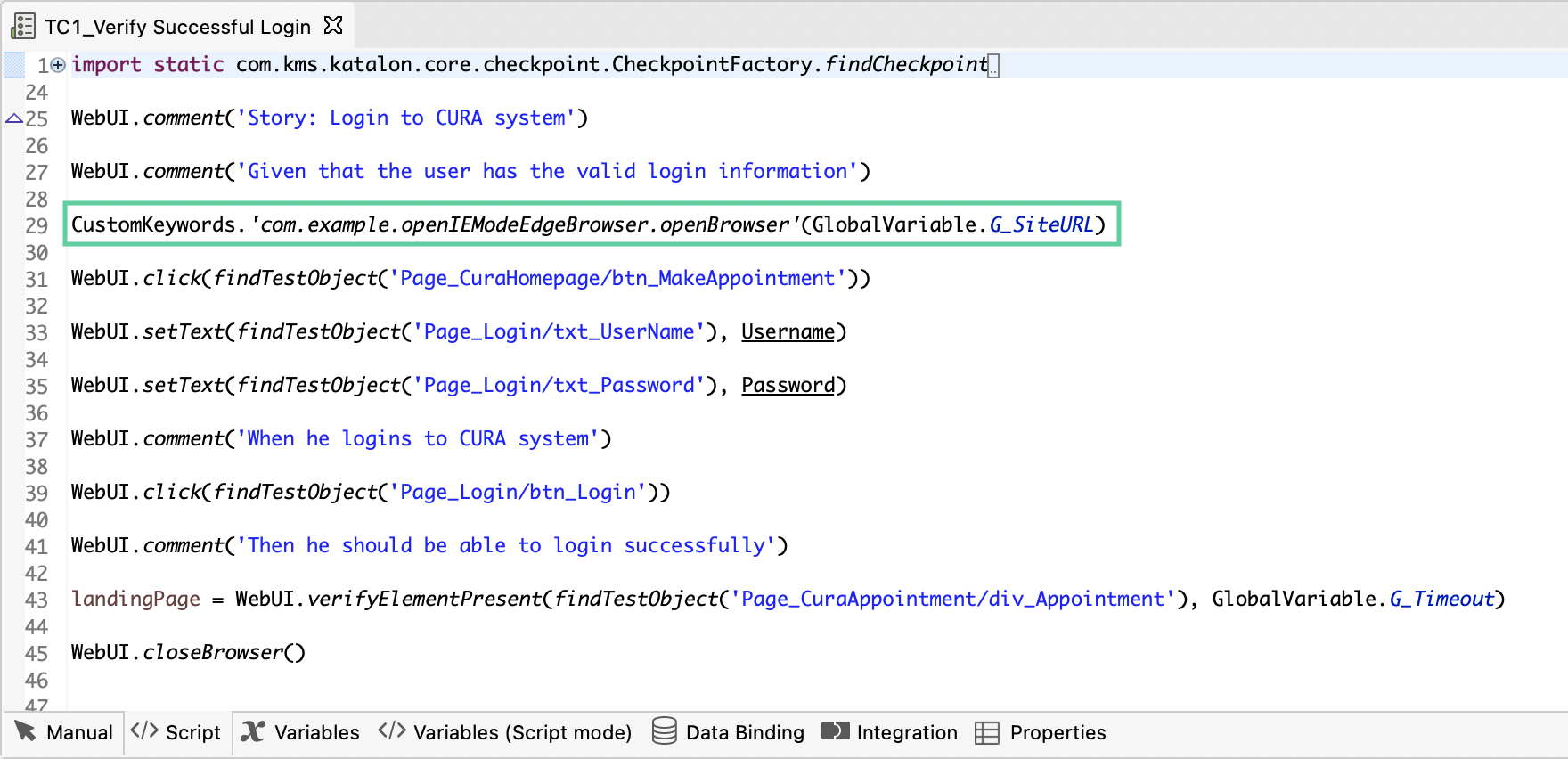 to open Microsoft Edge in IE mode. To learn more about custom keywords in Katalon Studio, refer to this document: Introduction to Custom Keywords.