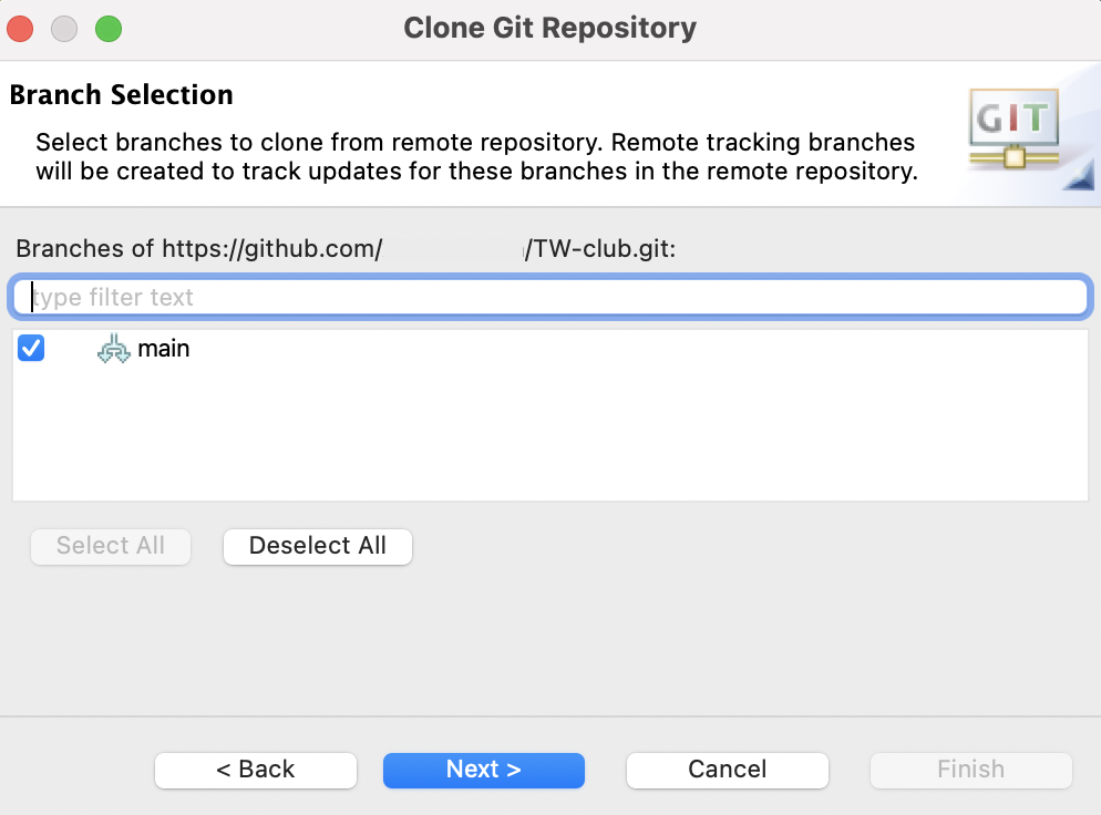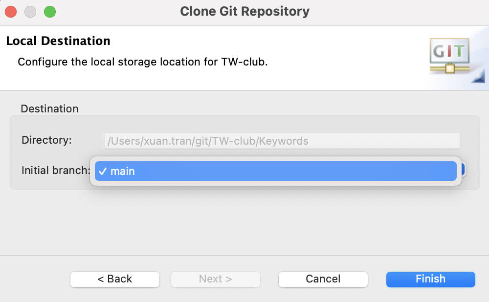 Katalon Studio will clone the Git repository to a default location in your project folder. Choose your initial branch and click Finish.