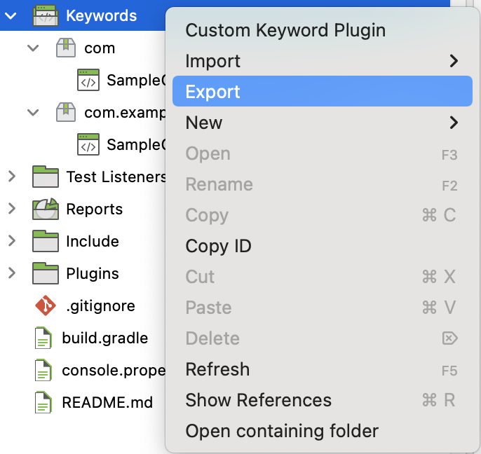 To increase code usability, Katalon Studio also let you export keyword for sharing across team members. Simply right-click on Keywords in the Tests Explorer, select Export from the context-menu.