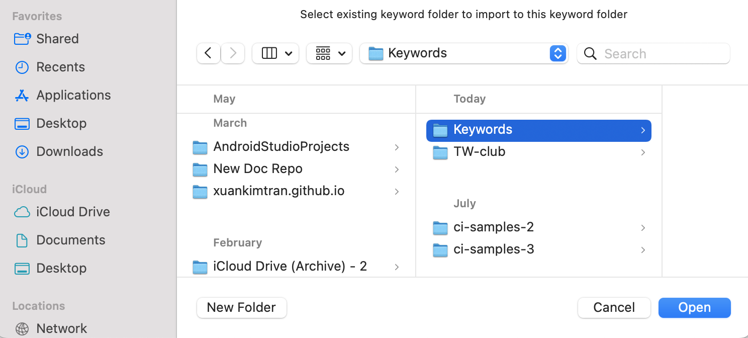 Additionally, you can import keywords from the Tests Explorer by right-clicking on the Keywords folder and choose Import > Folder or Git.