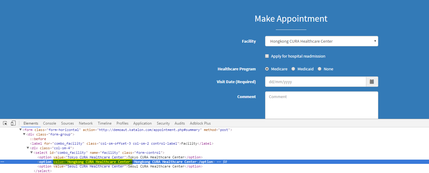 Enter the following script when you want to select Hongkong CURA Healthcare Center option on the Facility drop-down list: