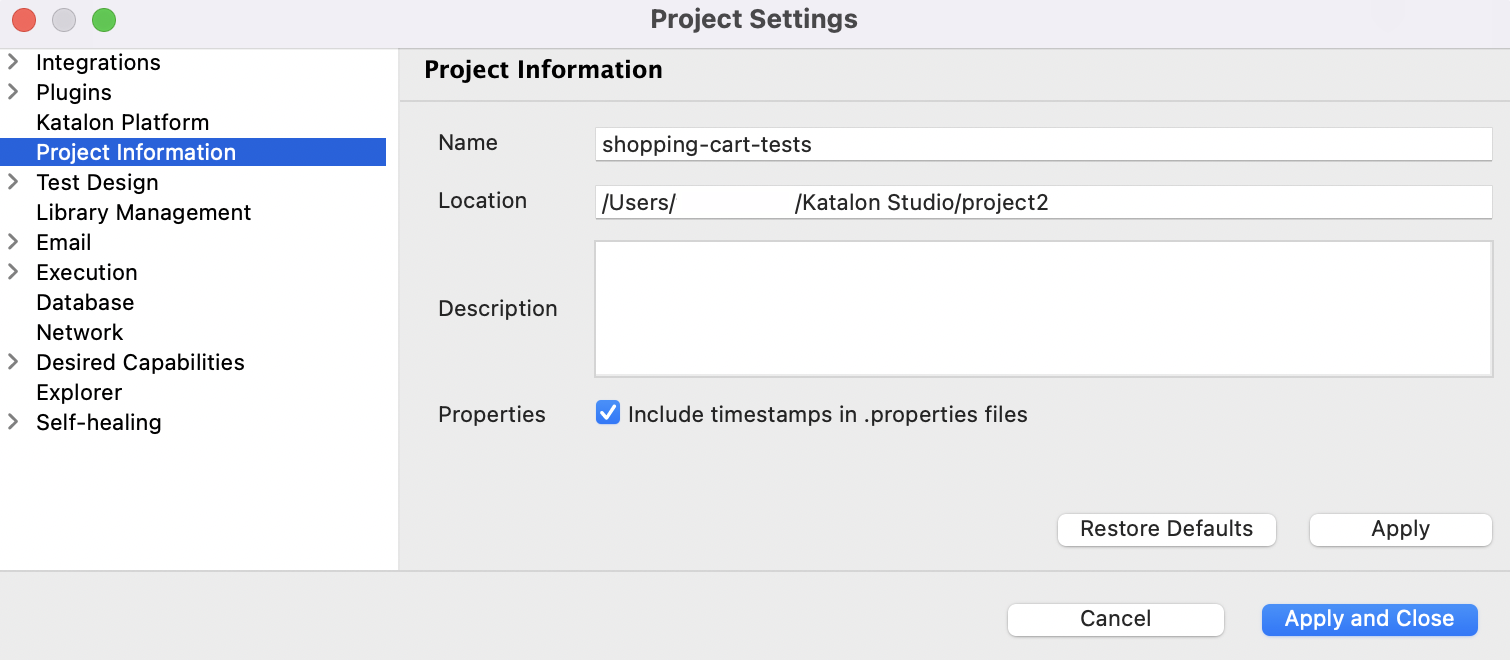 To view the project information in Katalon Studio, go to Project > Settings > Project Information.