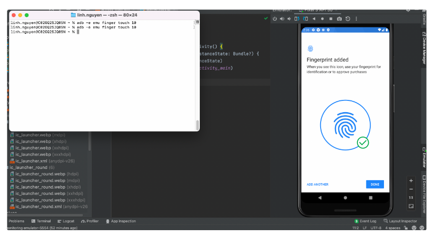 Manage projectsSet up projectsMobile testingAndroidConfigure fingerprint setting in an Android emulatorConfigure fingerprint setting in an Android emulator📋Copy pageHere is the sample app for this guide.You can also see this video for demonstration. Create an emulator with Fingerprint settings, for instance Pixel 3 API 30.We can select any of the options below for the screen lock setting.Use the adb command to emulate finger touching action.//Open terminal adb -e emu finger touch <finger ID> //finger ID from 1 to 10 Ex: adb -e emu finger touch 10 The fingerprint emulation is accomplished.