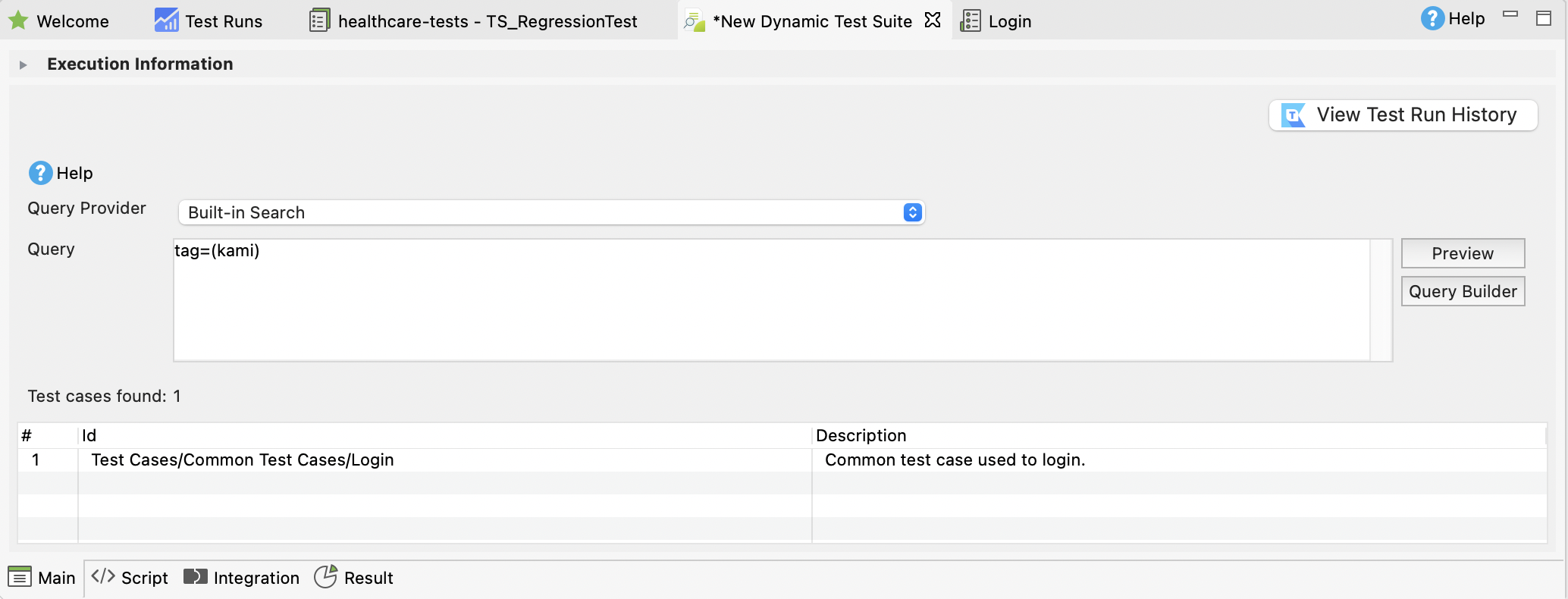 A dynamic test suite (DTS) is a test suite with multiple test cases added via a search query. You can dynamically add test cases based on the ID, name, tag, comment, and description of a test case.