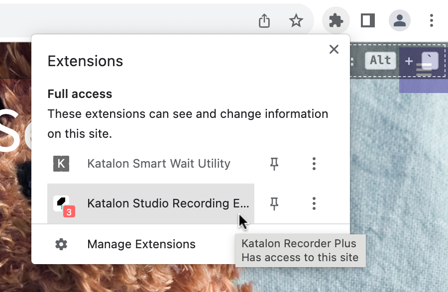 When recording with an Active browser, you must install the Katalon Studio Recording Engine extension to enable proper recording functionality.