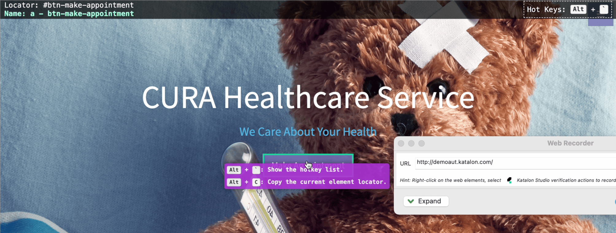 When hovering over an element, this shortcut copies its locator (for example, #btn-make-appointment) to your clipboard, making it easy to reuse in your test scripts.
