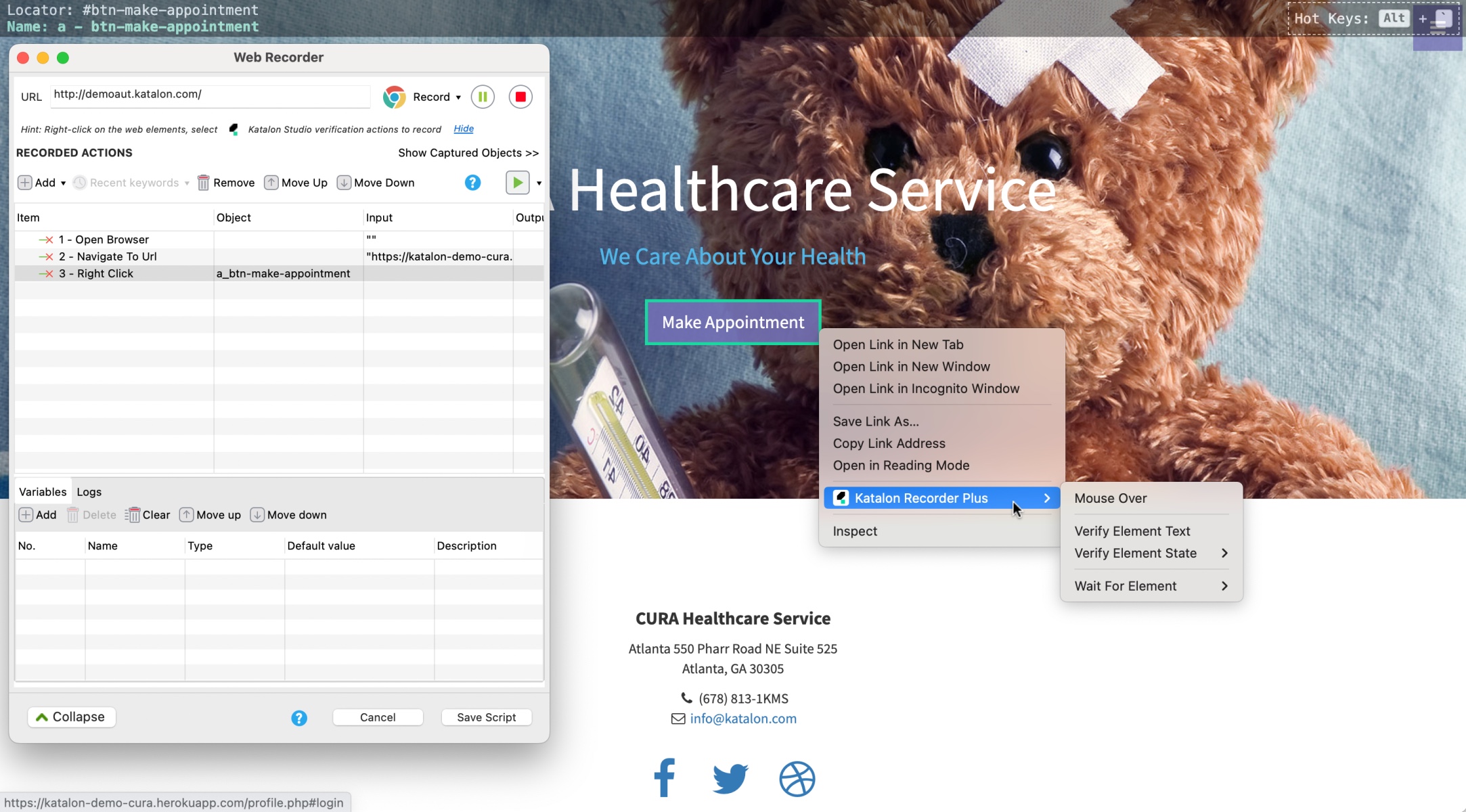 The following table shows objects captured by each application on our demo website https://katalon-demo-cura.herokuapp.com/