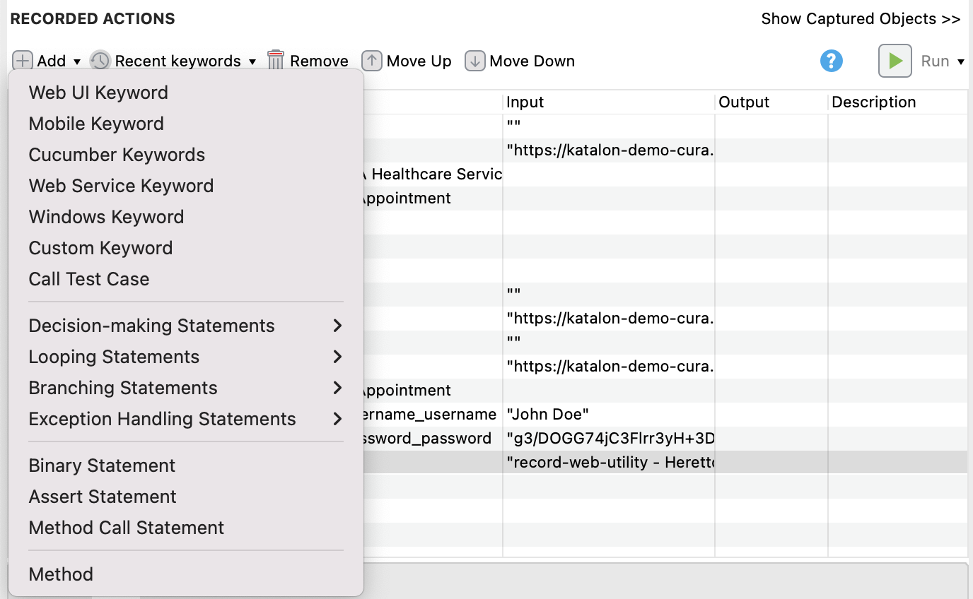 Katalon Studio built-in keywords. You can add any action, call another test case, and/or use Custom Keywords.