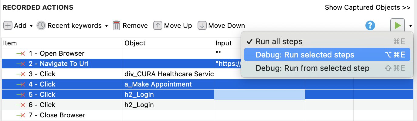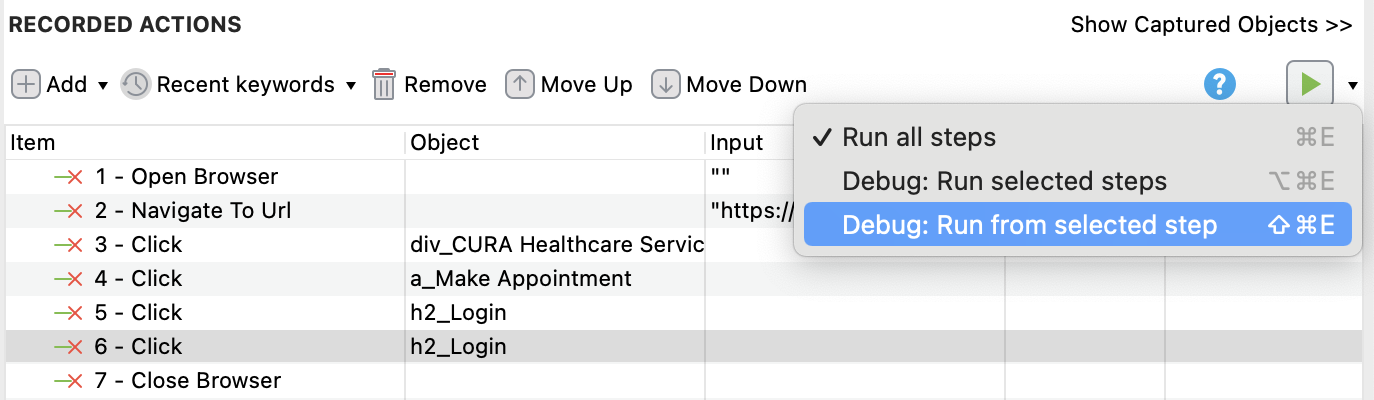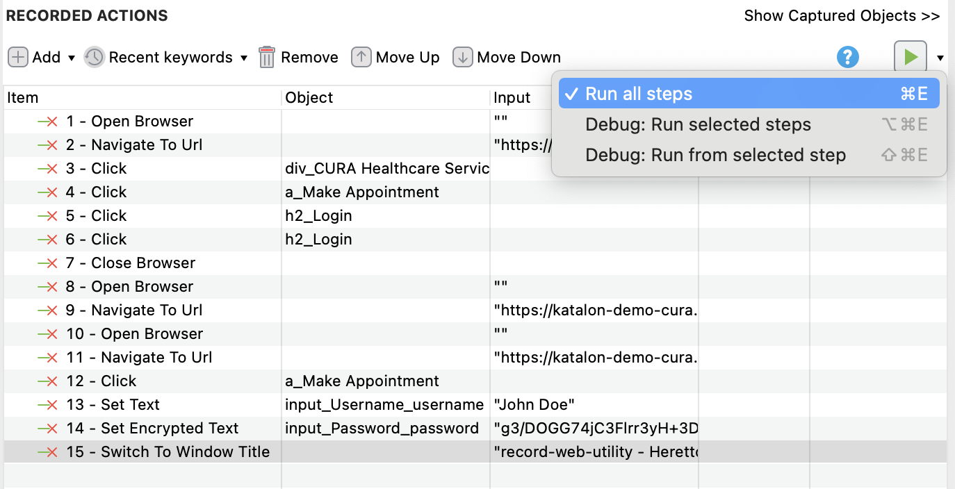In the drop-down list of the Run button, you can find some Run options. The two of them labeled with Debug are advanced options for validating recorded script, and saving you from running all test steps over and over again if you have a Katalon Studio Enterprise license:
