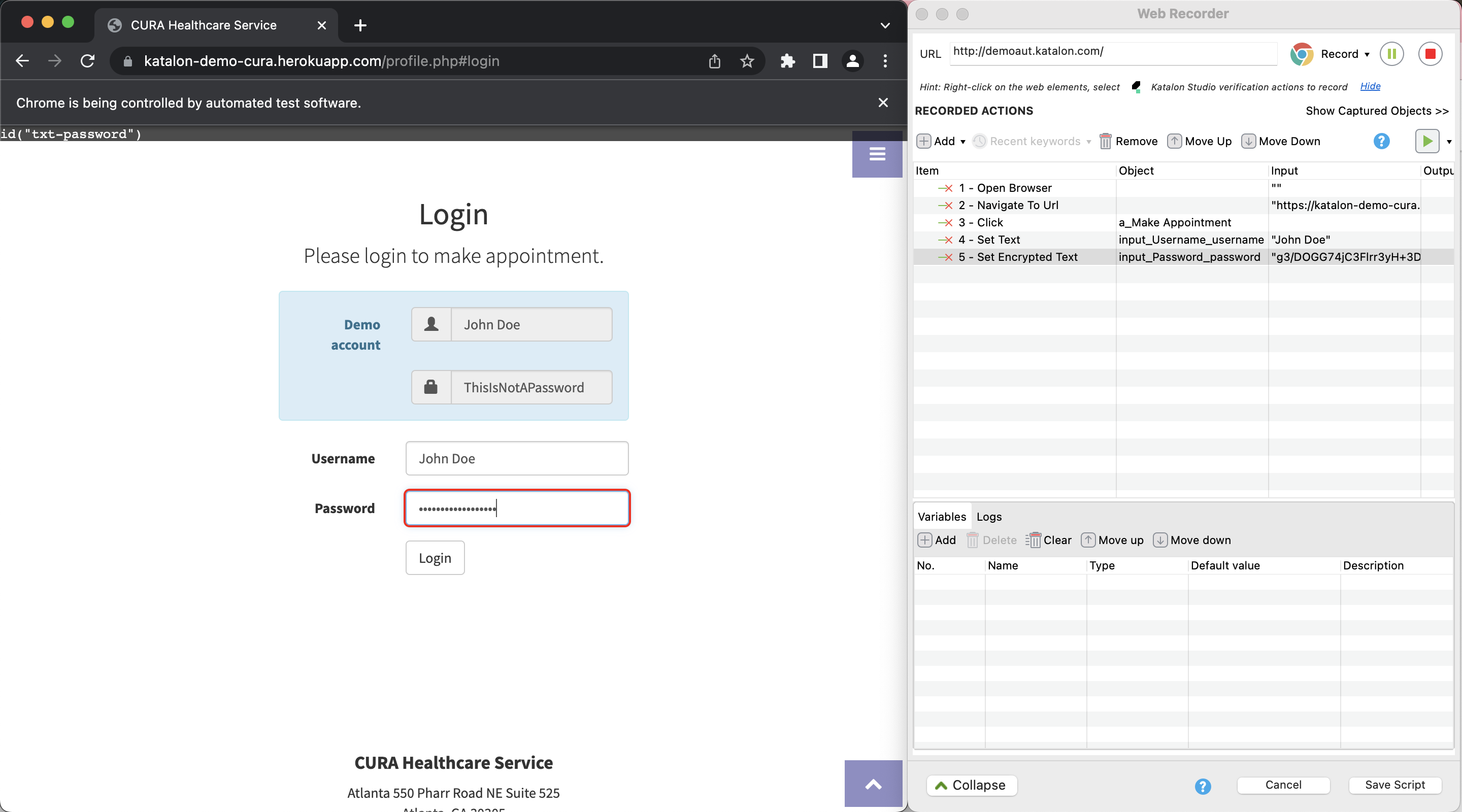 - Interact with the web page. In this example, user signs in with the provided credentials. The recorded steps are generated automatically in Recorded Actions. When user types in a password in the Password field, Katalon Web Recorder uses the Set Encrypted Text keyword automatically. The input value is encrypted to ensure security.