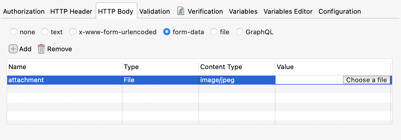 , and attach files to your request. You can specify the content type in the form-data body.file: Select the file you want to send with the request.