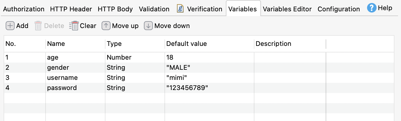 To use variables in a request, you define them in the Variables tab or the Variables Editor tab.