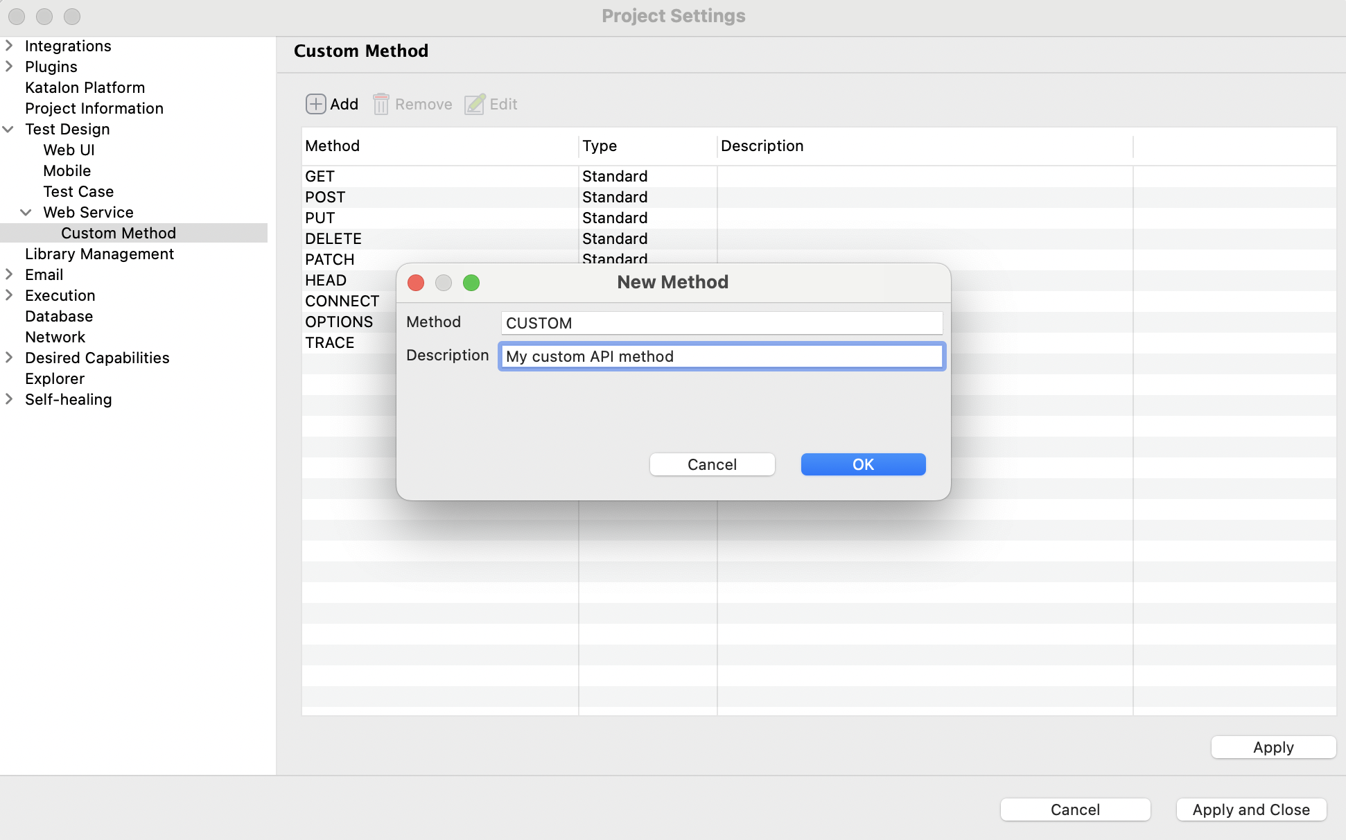 For KSE users, you can add custom method to the project by clicking Customize API methods to open the Project Settings dialog, then click Add.