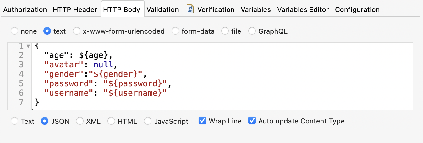By default, Katalon Studio selects none for HTTP body. If you need to send a body with your request, choose among these data types: text, x-www-form-urlencoded, form-data, file, and GraphQL.