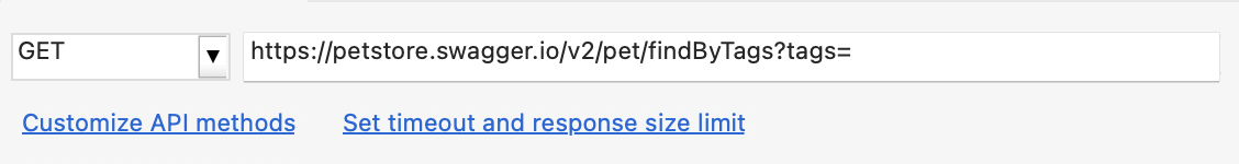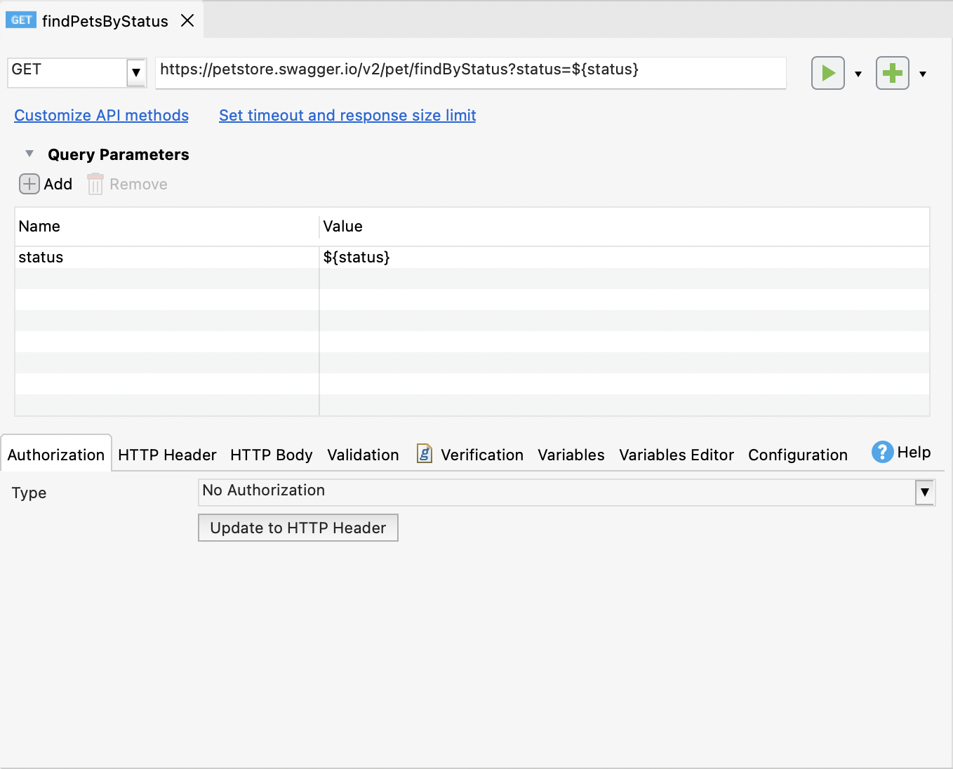 You need to specify a URL indicating the service endpoint of each request. Request URL tells the web server which API is utilized under test. Any mismatch between method and URL leads to an invalid request exception at runtime or a wrong data response. For example, the URL https://petstore.swagger.io/v2/pet/findByStatus?status=${'{'}status{'}'}