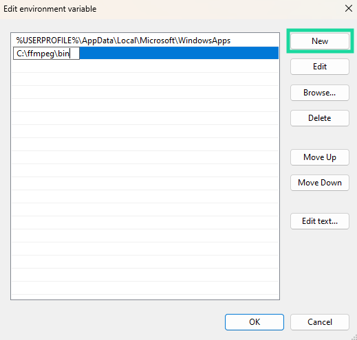 Add the path to the FFmpeg executable file to your PATH environment variable. See Add FFmpeg to PATH on Windows.