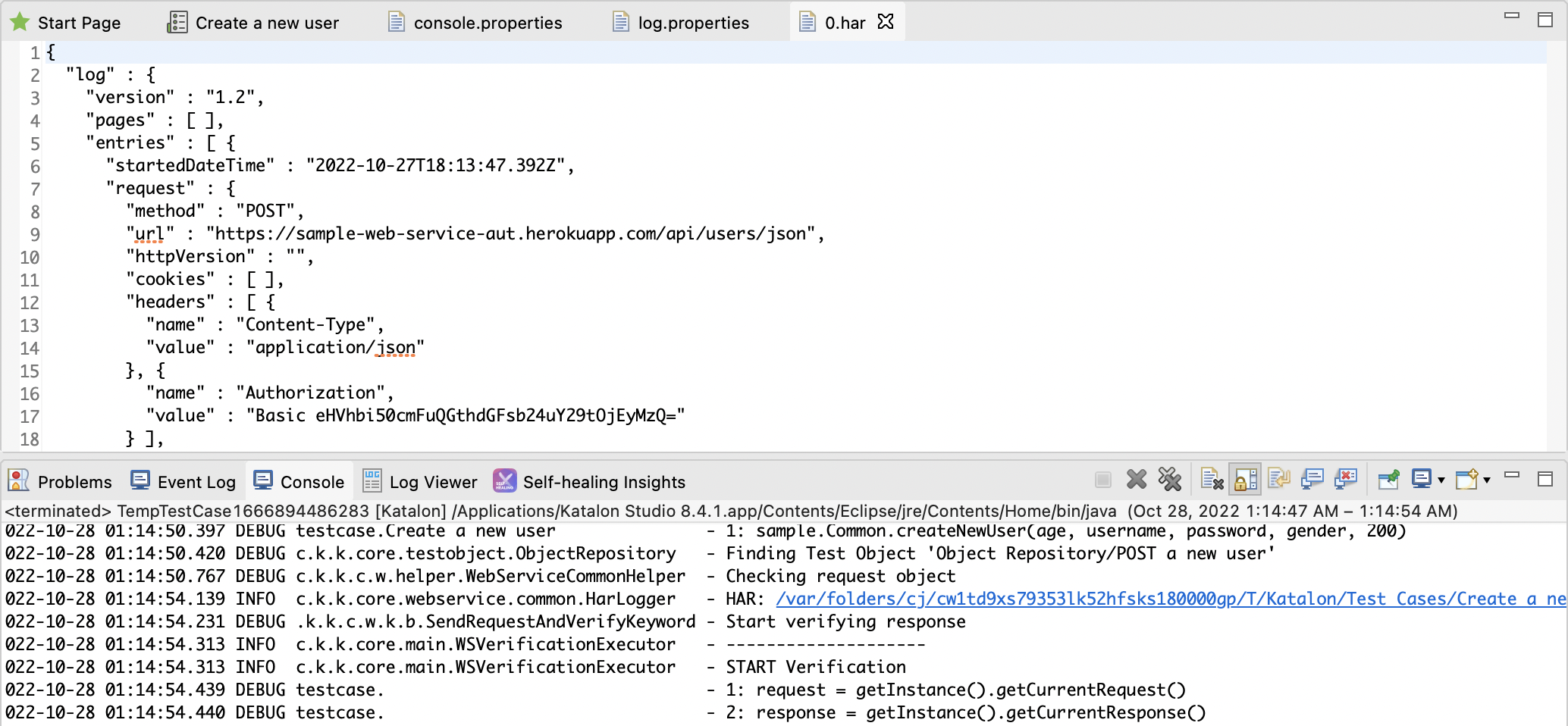 file in the Web Service execution log. Upon sending requests, you can access the .har