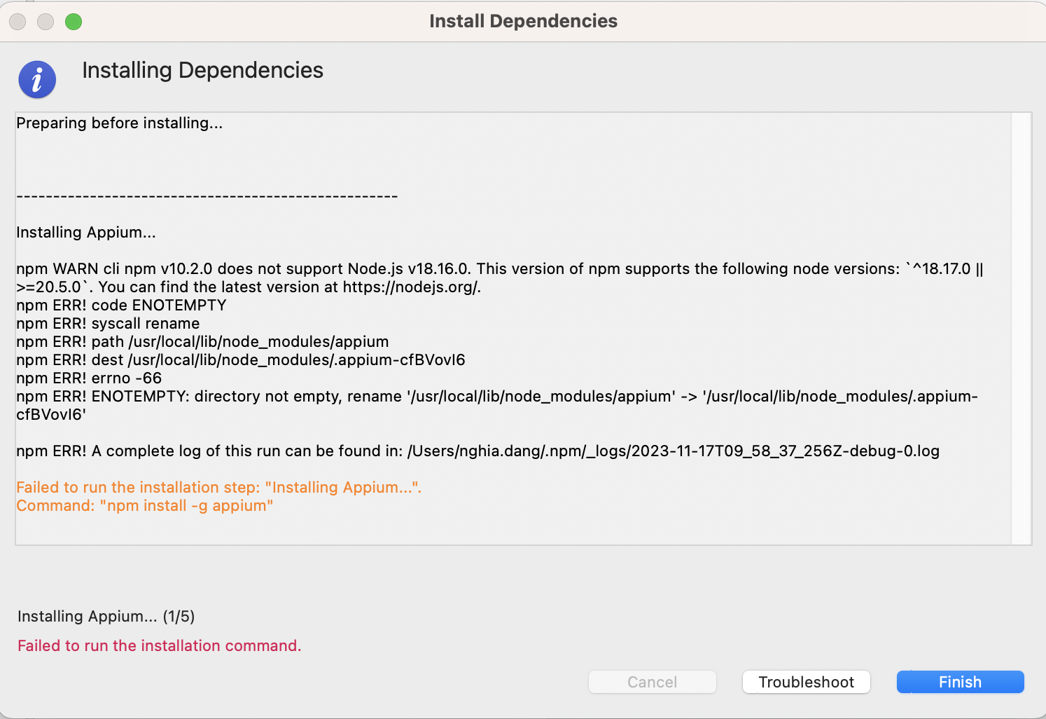 version 8 or later.Failed to install Appium.