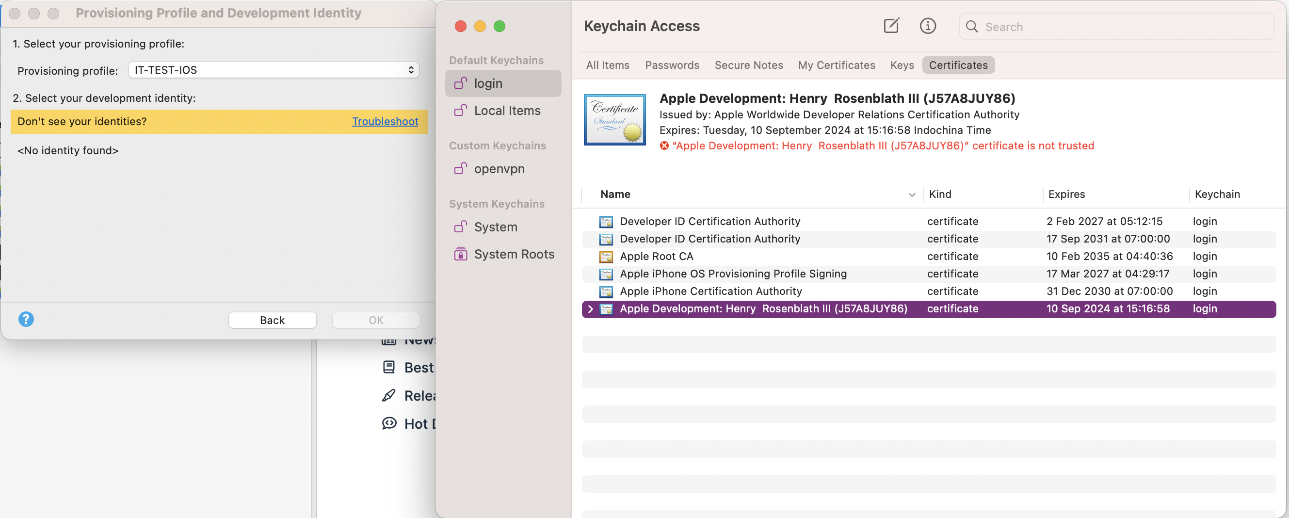 Make sure that the Apple Worldwide Developer Relations Certificate Authority is added to the login keychain.